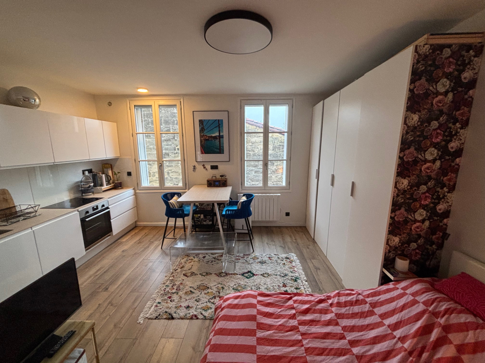 Dans un Immeuble en Pierre avec une belle hauteur sous plafond, Au pied de la Ligne Tram D et à 5 mins du Centre Ville de Bordeaux 33000 et de tous ses commercants, venez découvrir ce magnifique studio sans vis à vis au calme d'une petite copropriété sécurisée. Possibilité de mettre une mezzanine pour le lit.